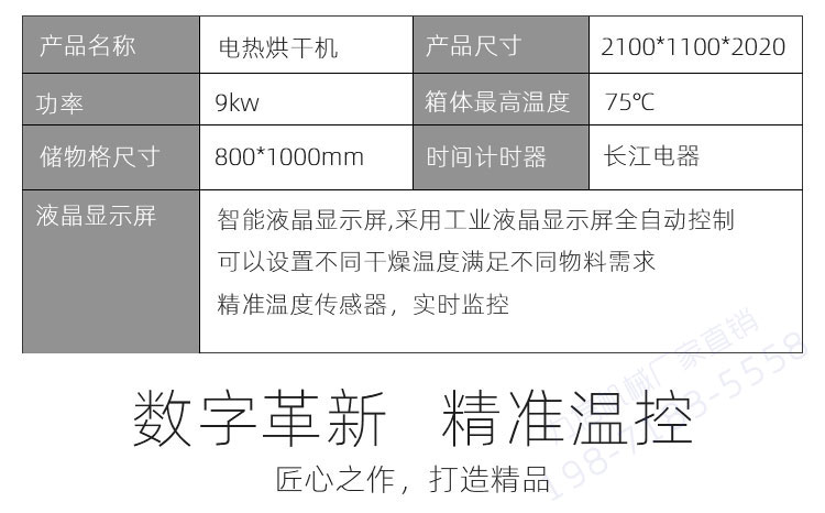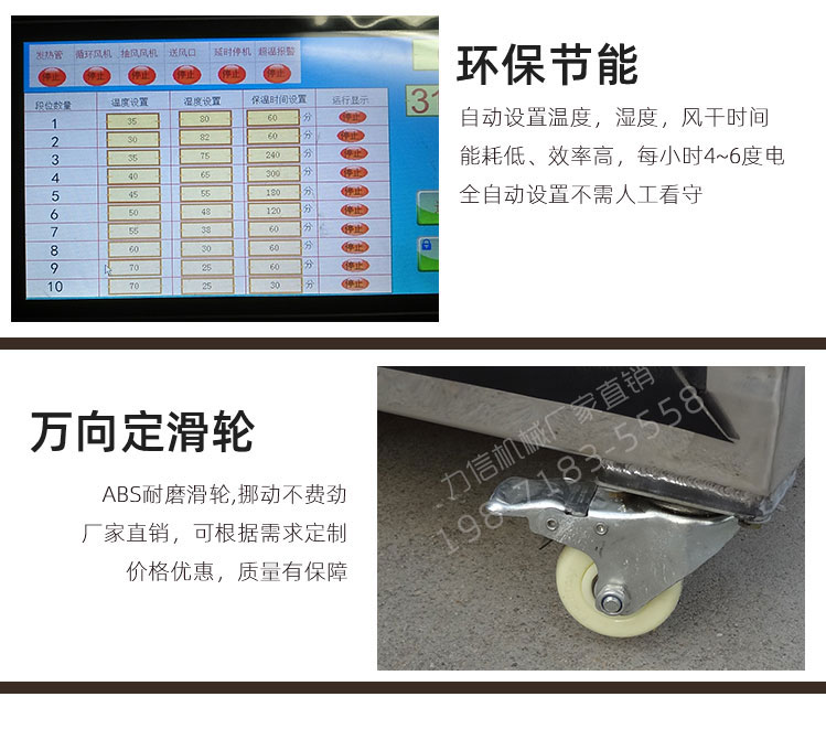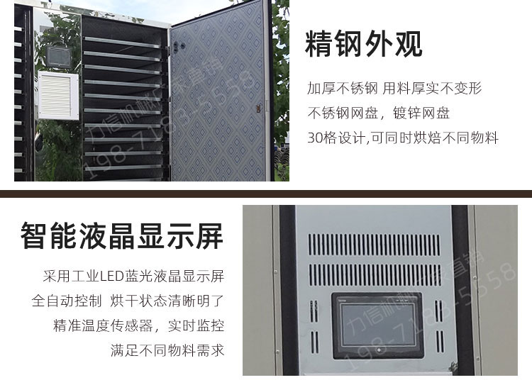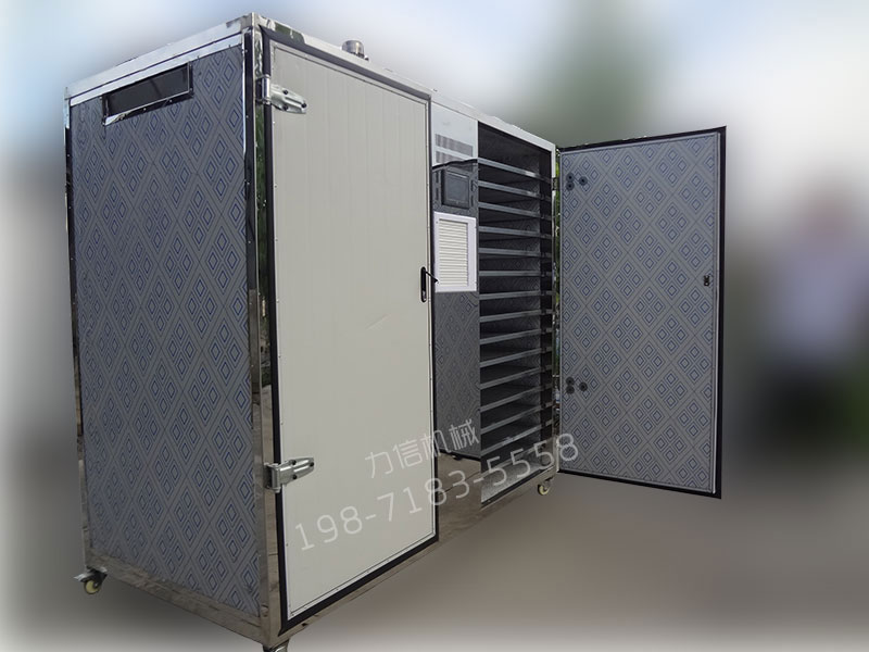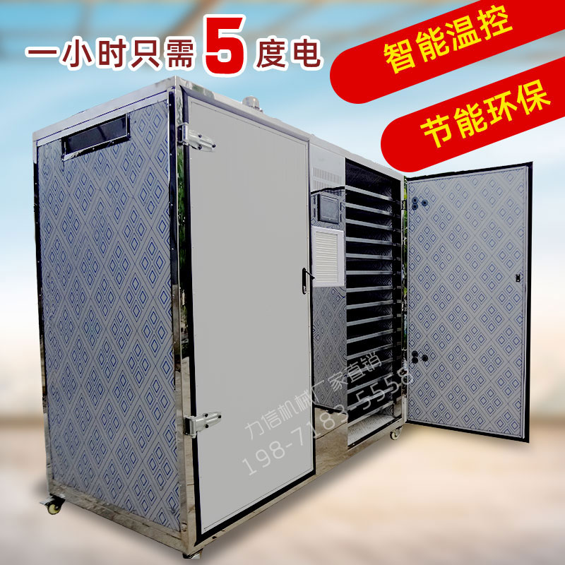 智能環(huán)保電熱烘干機,通過7寸觸摸屏可設置濕度、溫度、烘干時間。烘干機內部采用耐高溫高濕的風機使熱風在烘干箱內進行循環(huán),有多個出風口,強大的風量以及360度左右循環(huán)風路讓烘干箱各個地方溫度均勻,不需要上下翻動篩網(wǎng)。熱風循環(huán)時不斷地帶走物料的濕氣,自動排濕系統(tǒng)快速讓物料烘干,其烘干周期短,耗電量低,烘干物料顏色均勻,效率高。烘干過程中設置好參數(shù)后無需人員看管,智能化程度高,操作簡單。是目前市場上被客戶高度認可的一款高效節(jié)能環(huán)保烘干機 。廣泛用于食用菌行業(yè)烘干香菇、茶樹菇等,亦可用于烘干藥材、茶葉、海鮮、蔬果等物料。